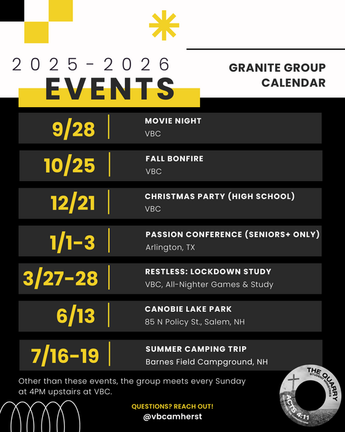Village Bible Church's desires to glorify God by raising up the next generation of people to carry out our Lord's Great Commission. Whether that be at home or abroad, we labor to help kids know about Jesus and know Him personally. To do this, our student ministry, called the Quarry, is rooted in the Scriptures with the aim to discover the Cornerstone, Jesus Christ, and build their lives on Him. Whether at school, with friends, or wherever they find themselves, we long for VBC students to embrace and live out the good news of Jesus Christ!